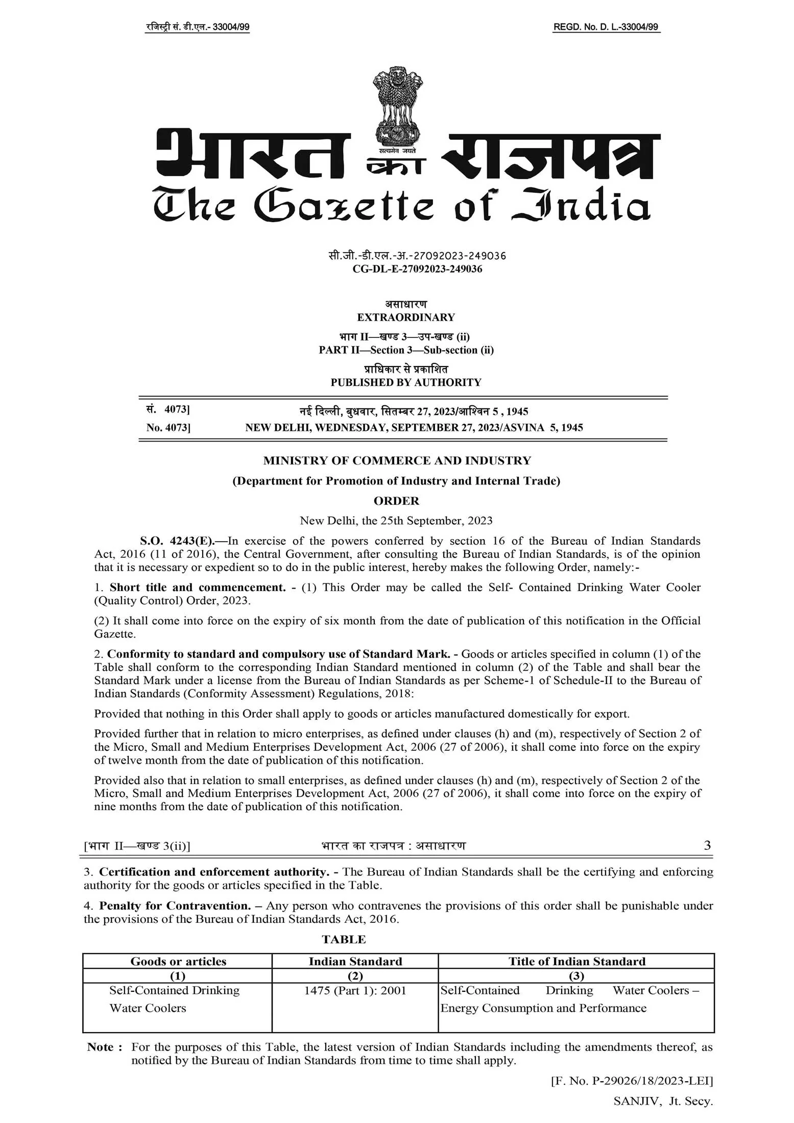 QUALITY CONTROL ORDER (TECHNICAL REGULATION) ISSUED BY THE DEPARTMENT FOR PROMOTION OF INDUSTRY AND INTERNAL TRADE, MINISTRY OF COMMERCE AND INDUSTRY, GOVT. OF INDIA ON 25 SEPTEMBER 2023 FOR MANDATORY BIS CERTIFICATION
