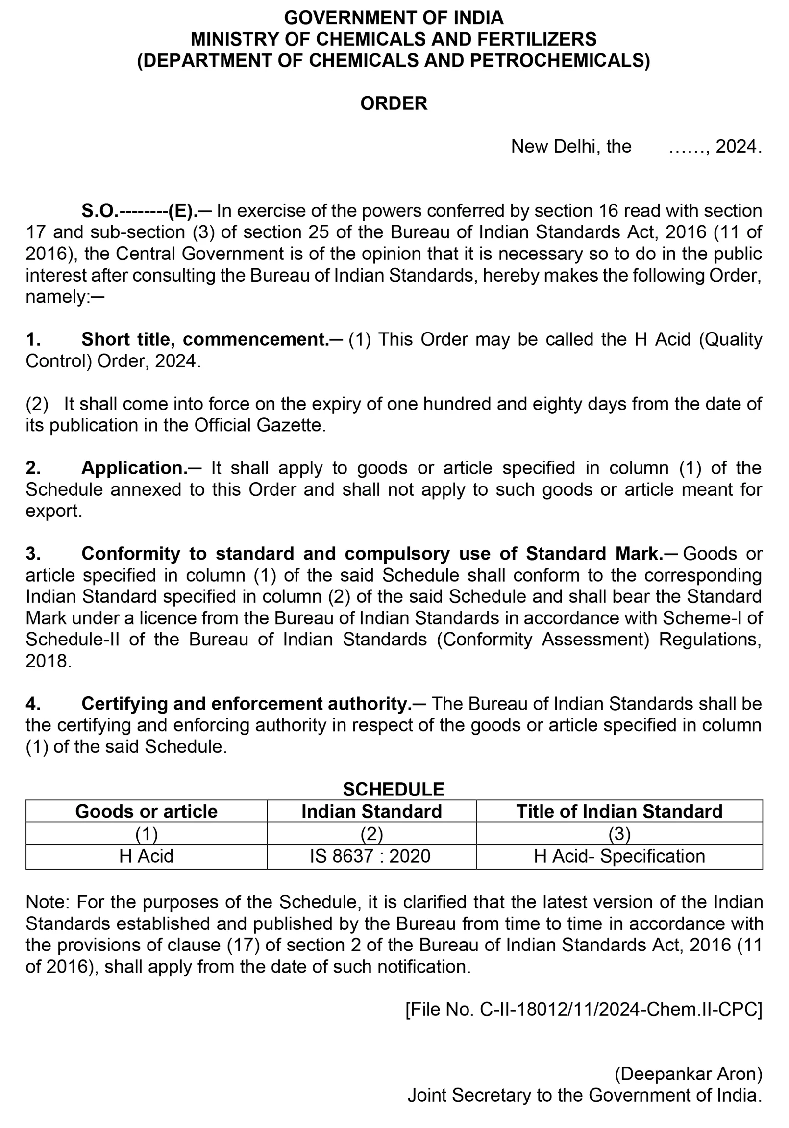 The Department of Chemicals and Petrochemicals, Ministry of Chemicals and Fertilizers, Govt. of India, has issued a draft order, proposing to make it mandatory for H Acid to be used in India, whether manufactured in India or imported from foreign countries, to carry the Standard Mark of the Bureau of Indian Standards under a valid BIS licence.