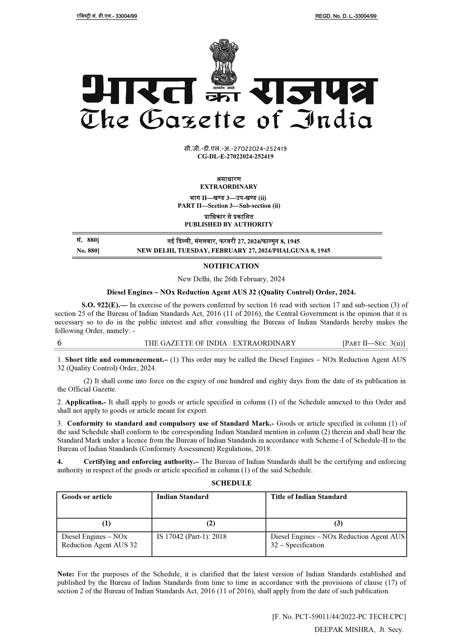 The Deapartment of Chemicals and Petrochemicals, Ministry of Chemicals and Fertilizers, Govt. of India, has issued a QCO for Diesel Engines-NOx reduction, making BIS Certification for AUS 32 as per IS 17042 (Part 1) mandatory, whether manufactured in India or imported from foreign countries, shall mandatorily carry the Standard Mark of the Bureau of Indian Standards under a valid BIS licence. In short, it has become obligatory for all the manufacturers of AUS 32, whether in India or overseas, to immediately apply for BIS licence and obtain a valid BIS certification licence as per IS 17042 (Part 1) for AUS 32 before that the last date of implementation of the order, i.e., 25 August 2024.