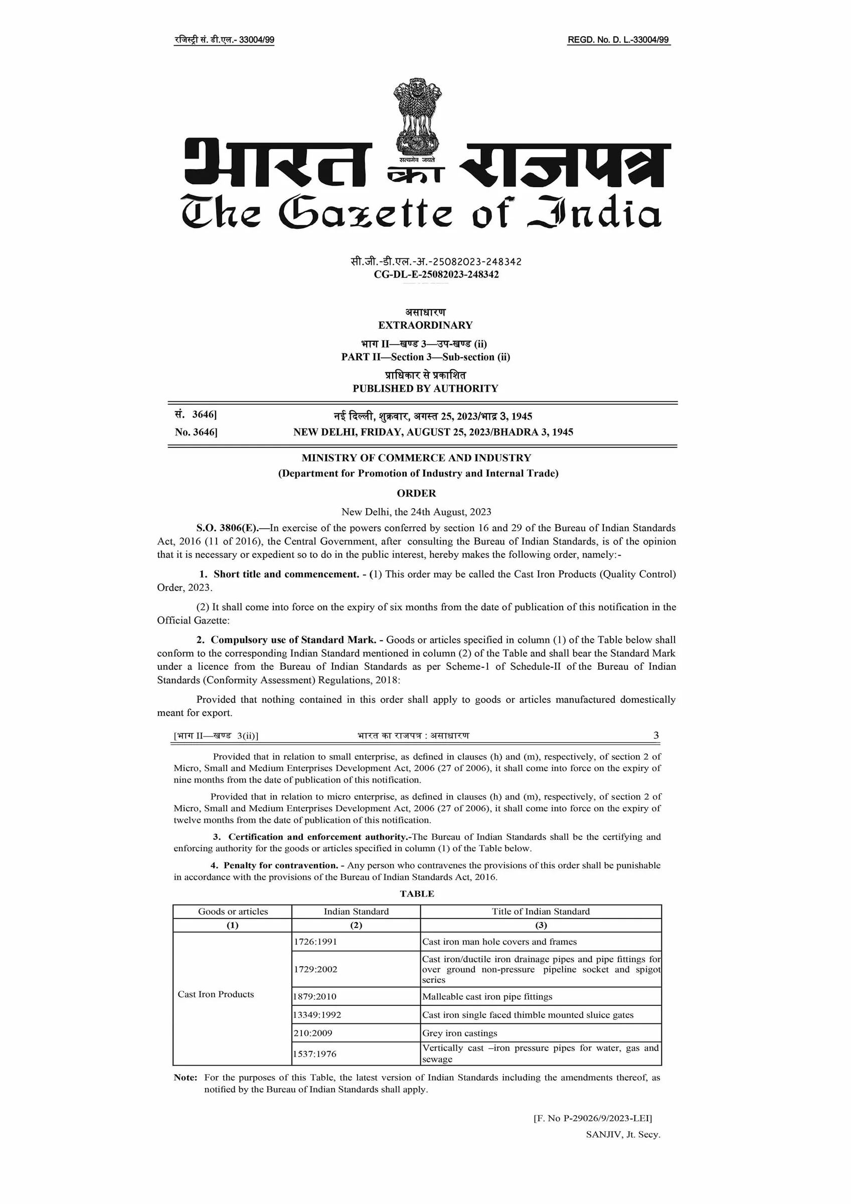 The DPIIT, Ministry of Commerce & Industry, Govt. of India, has issued an order, making it mandatory for grey iron castings to be used in India, whether manufactured in India or imported from foreign countries, shall mandatorily carry the Standard Mark (ISI Mark) of the Bureau of Indian Standards under a valid BIS licence. In short, it has become obligatory for all the manufacturers of grey iron castings from 23 Feb 2024, whether in India or overseas, to immediately apply for BIS licence and obtain a valid BIS certification licence.