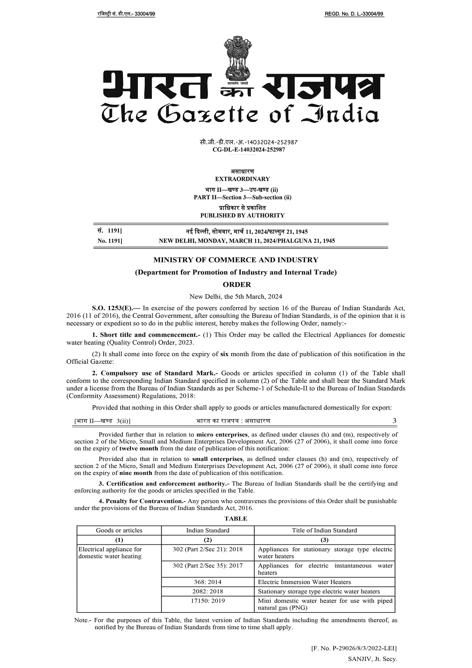 The DPIIT, Ministry of Commerce & Industry, Govt. of India, has issued an order, making it mandatory for water heaters to be used in India, whether manufactured in India or imported from foreign countries, shall mandatorily carry the Standard Mark of the Bureau of Indian Standards under a valid BIS licence. In short, it has become obligatory for all the manufacturers of water heaters, whether in India or overseas, to immediately apply for BIS licence and obtain a valid BIS certification licence before that the last date of implementation of the order, i.e., 04 September 2024.