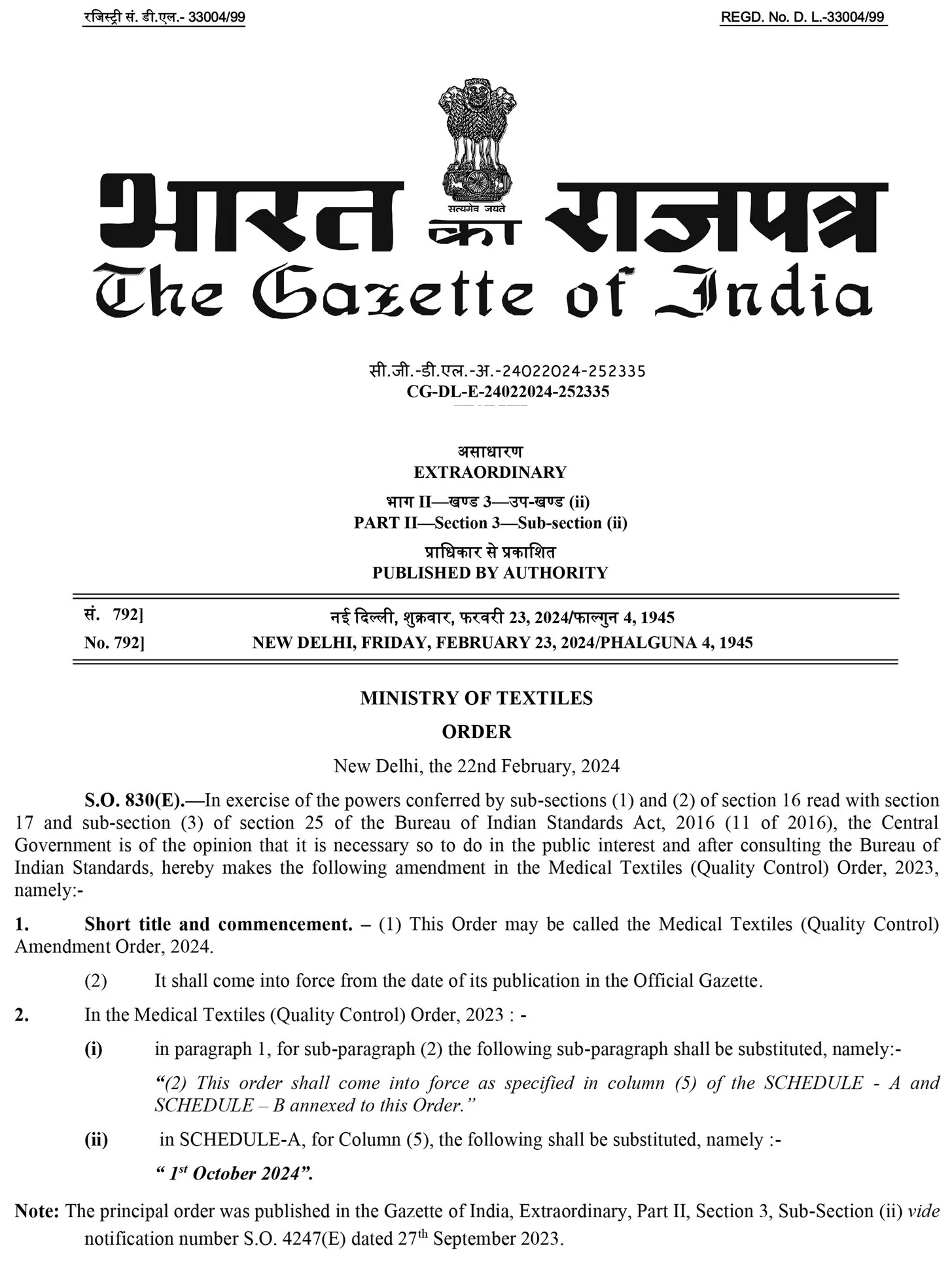 QUALITY CONTROL ORDER (TECHNICAL REGULATION) ISSUED BY MINISTRY OF TEXTILES, GOVT. OF INDIA ON 27 SEPTEMBER 2023 FOR MANDATORY BIS CERTIFICATION