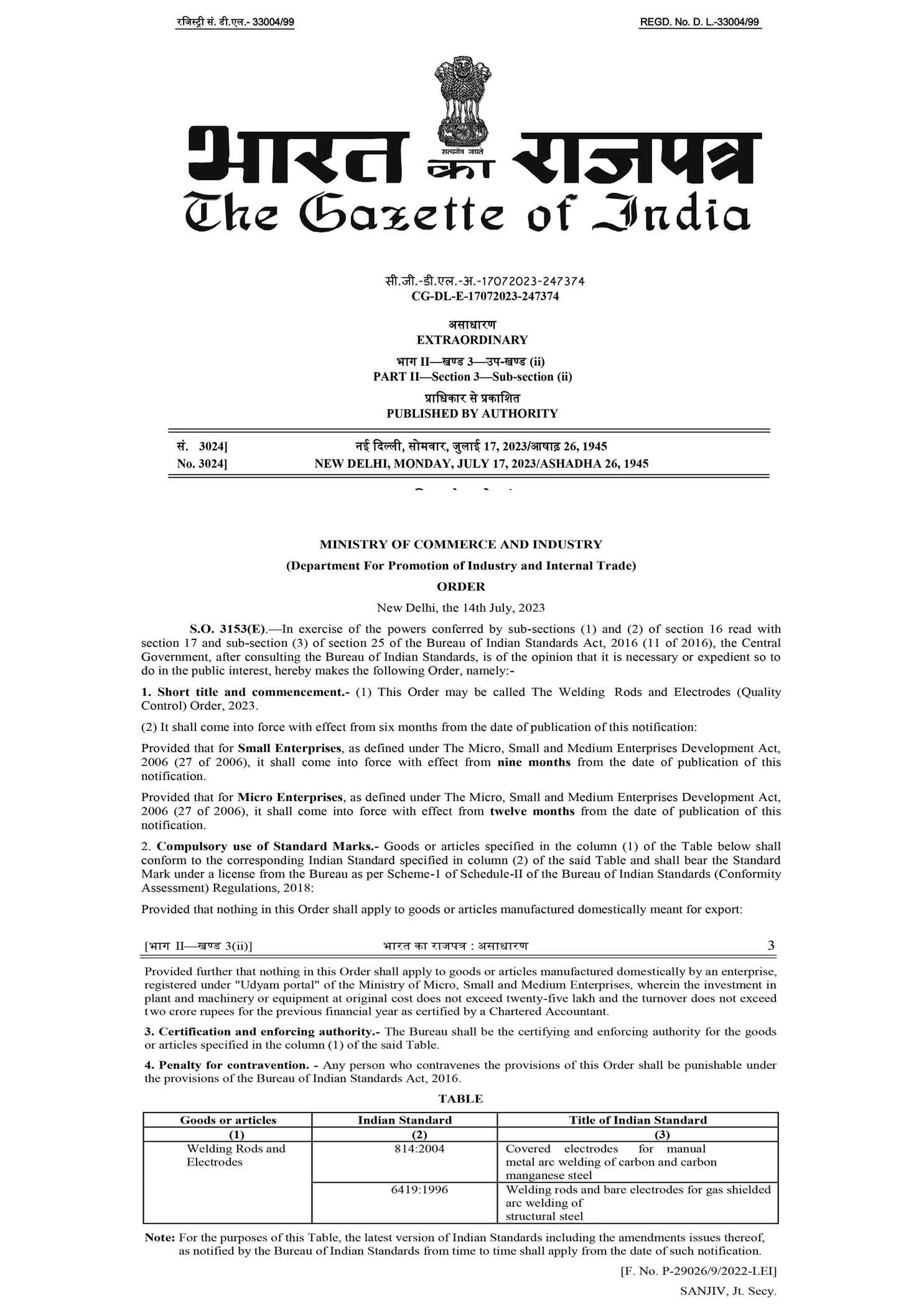 The DPIIT, Ministry of Commerce & Industry, Govt. of India, has issued an order, making it mandatory for electrodes to be used in India, whether manufactured in India or imported from foreign countries, shall mandatorily carry the Standard Mark (ISI Mark) of the Bureau of Indian Standards under a valid BIS license. In short, it has become obligatory for all the manufacturers of aluminium cans, whether in India or overseas, to immediately apply for BIS license and obtain a valid BIS certification license for electrodes.