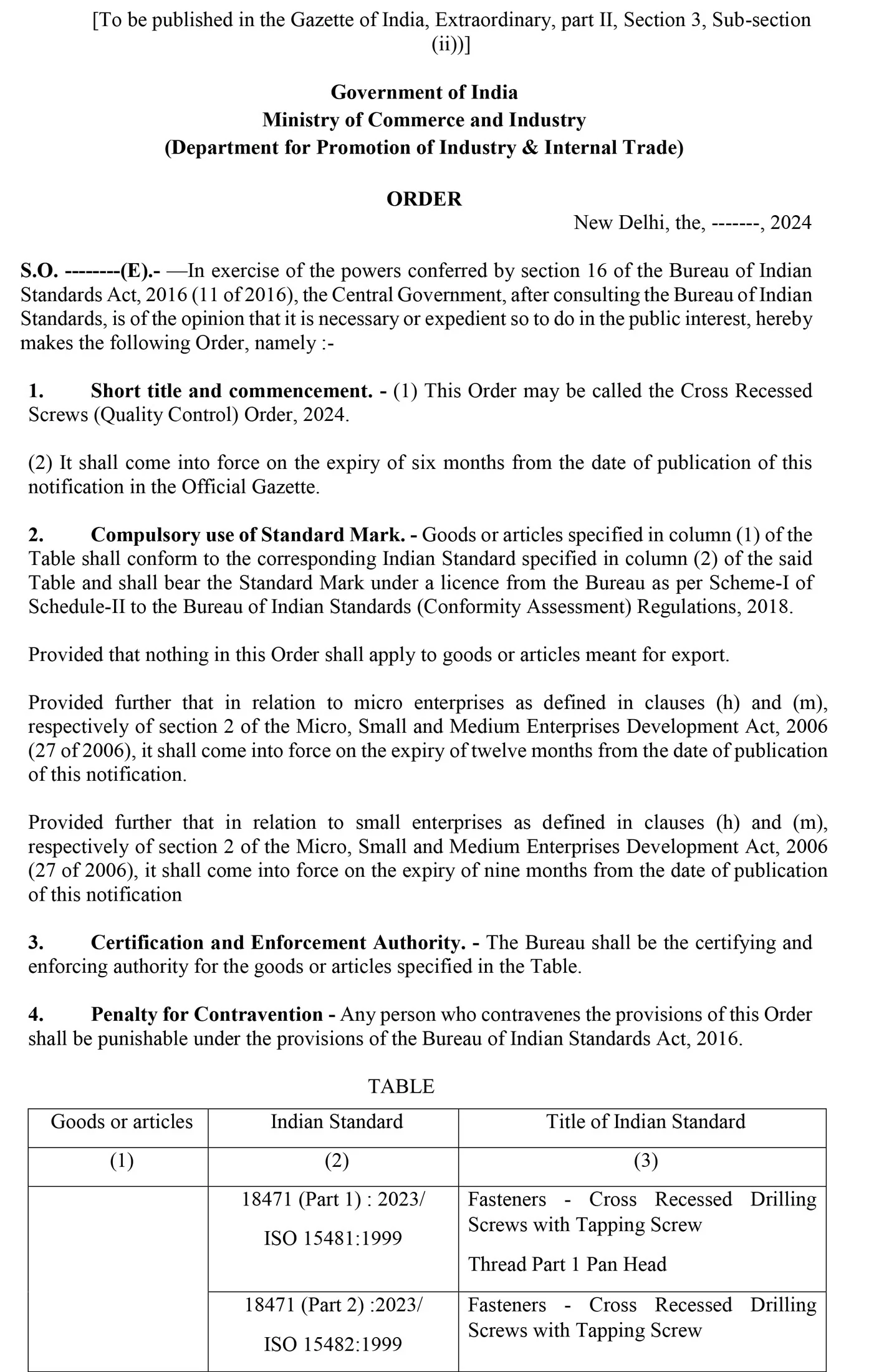 The DPIIT, Ministry of Commerce & Industry, Govt. of India, has issued a Quality Control Order making it mandatory for all cross recessed screws to be used in India, whether manufactured in India or imported from foreign countries, shall mandatorily carry the Standard Mark of the Bureau of Indian Standards under a valid BIS licence.