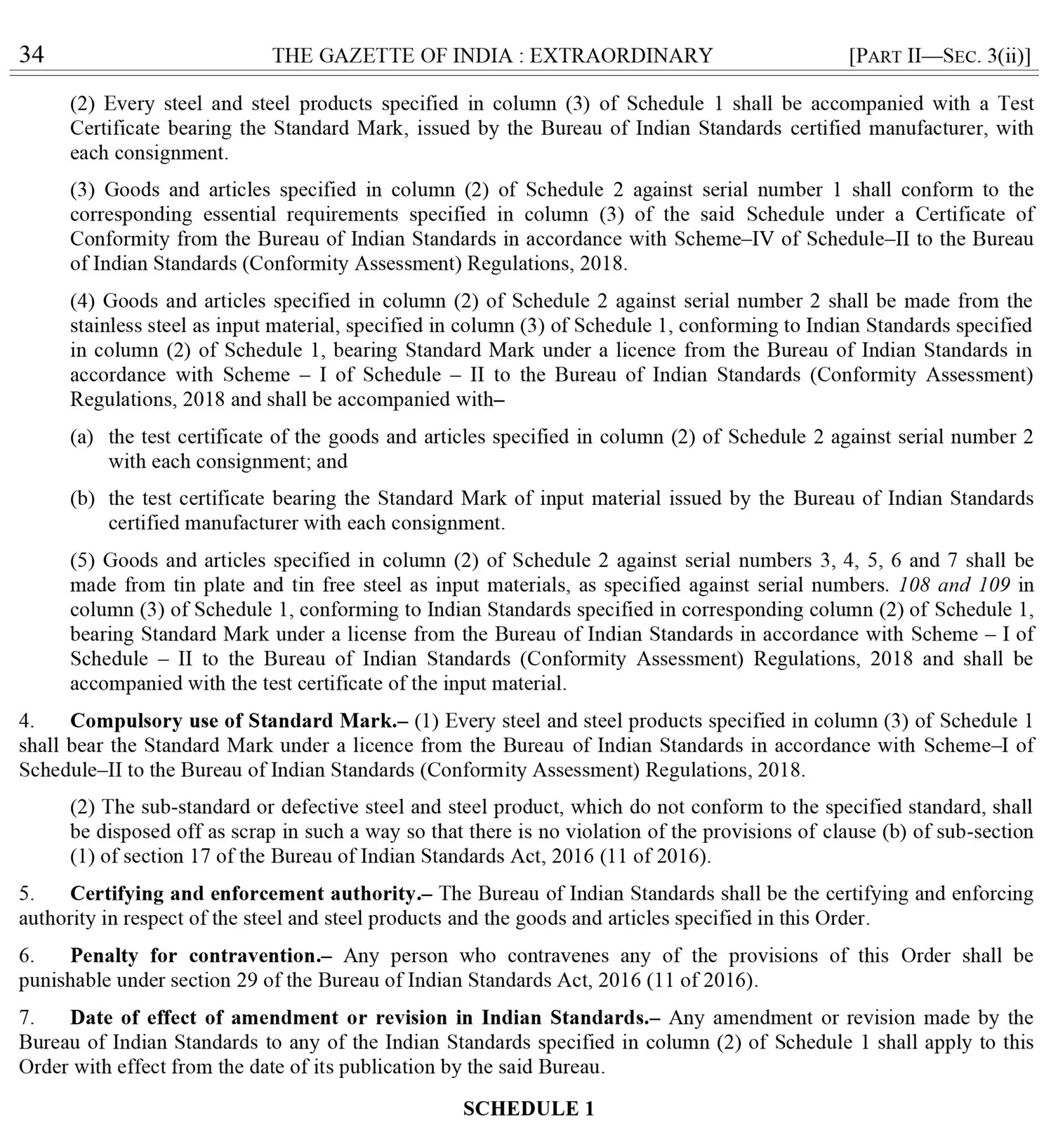 QUALITY CONTROL ORDER (TECHNICAL REGULATION) ISSUED BY THE TECHNICAL DIVISION, MINISTRY OF STEEL ON 01 MAY 2024 FOR MANDATORY BIS CERTIFICATION