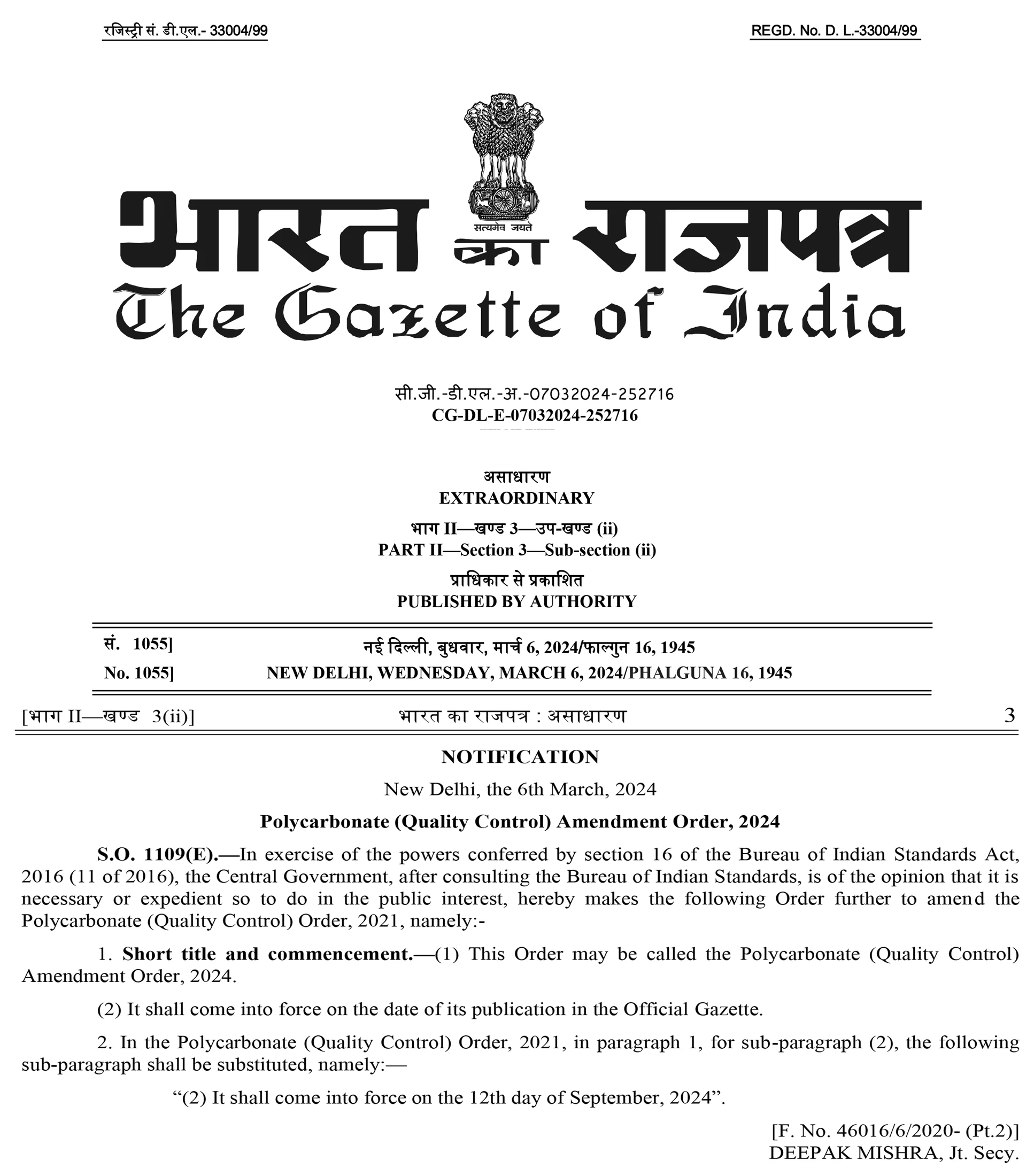 The Department of Chemicals and Petrochemicals, Ministry of Chemicals and Fertilizers, Govt. of India, has issued an order, making it mandatory for polycarbonate to be used in India, whether manufactured in India or imported from foreign countries, shall mandatorily carry the Standard Mark of the Bureau of Indian Standards under a valid BIS licence. In short, it has become obligatory for all the manufacturers of polycarbonate, whether in India or overseas, to immediately apply for BIS licence and obtain a valid BIS certification licence before that the last date of implementation of the order, i.e., 12 September 2024.