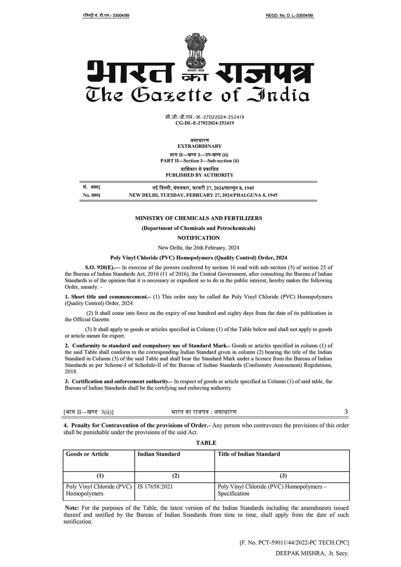 QUALITY CONTROL ORDER FOR PVC (QCO FOR PVC) ISSUED BY THE DEPARTMENT FOR CHEMICALS AND PETROCHEMICALS, MINISTRY OF CHEMICALS AND FERTILIZERS, GOVT. OF INDIA ON 26 FEBRUARY 2024 FOR MANDATORY BIS CERTIFICATION OF PVC HOMOPOLYMERS AS PER IS 17658