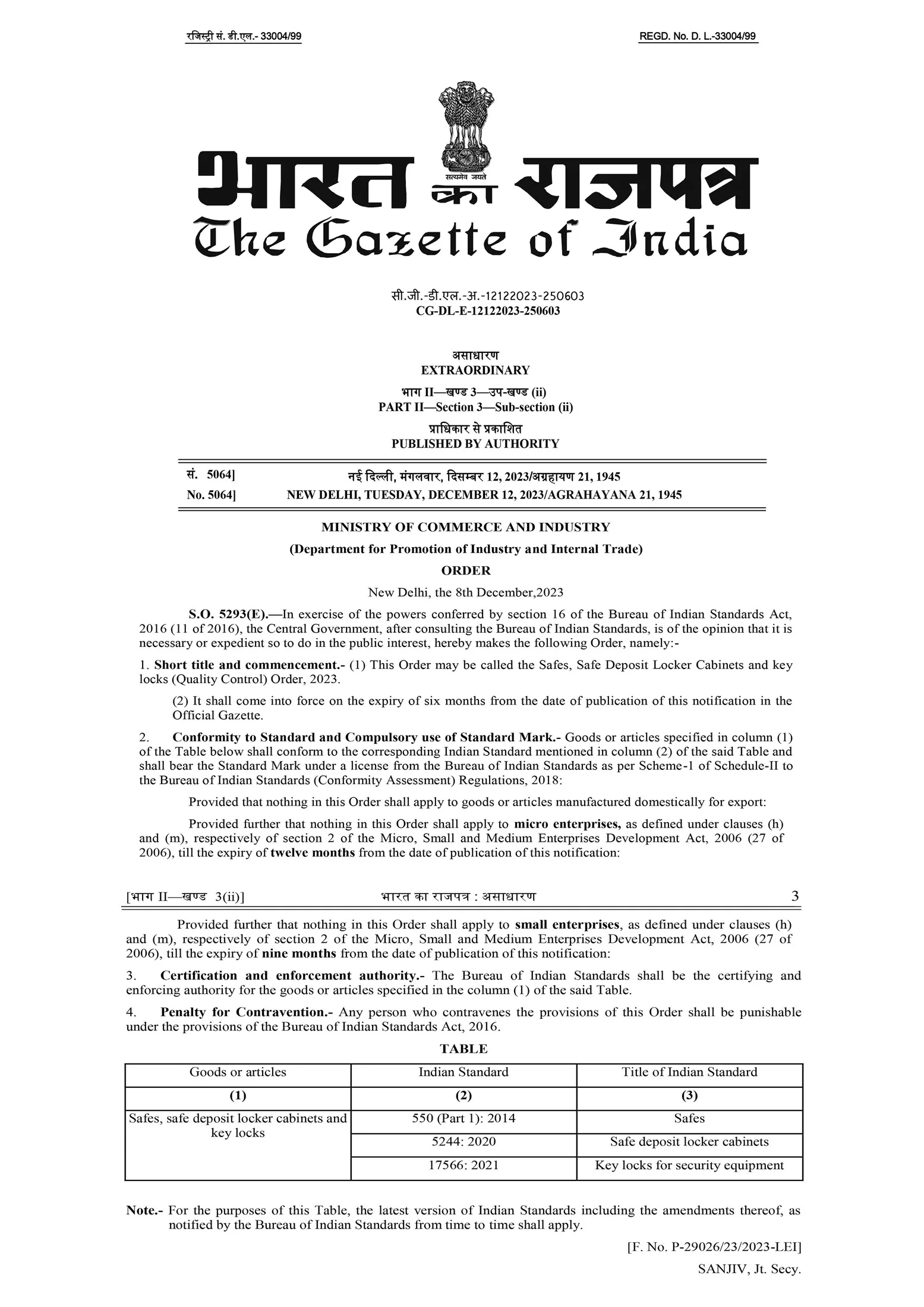 BIS CERTIFICATION OF SAFE, SAFE DEPOSIT LOCKER CABINETS AND KEY LOCKS FOR SECURITY EQUIPMENT AS PER IS 550 (PART 1):2022, 5244:2020 AND IS 17566:2021