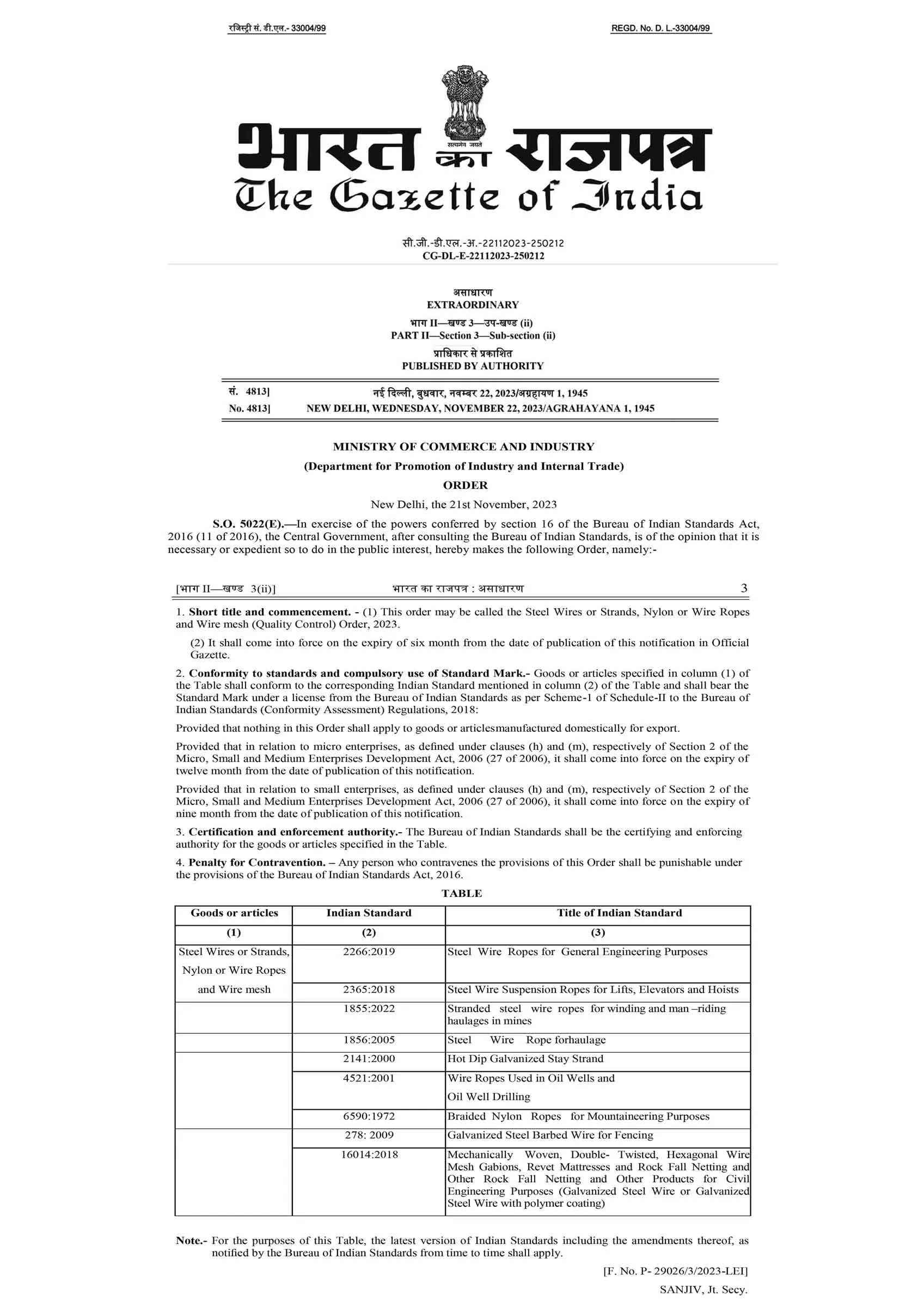 QUALITY CONTROL ORDER (TECHNICAL REGULATION) ISSUED BY THE DEPARTMENT FOR PROMOTION OF INDUSTRY AND INTERNAL TRADE, MINISTRY OF COMMERCE AND INDUSTRY, GOVT. OF INDIA ON 21 NOVEMBER 2023 FOR MANDATORY BIS CERTIFICATION