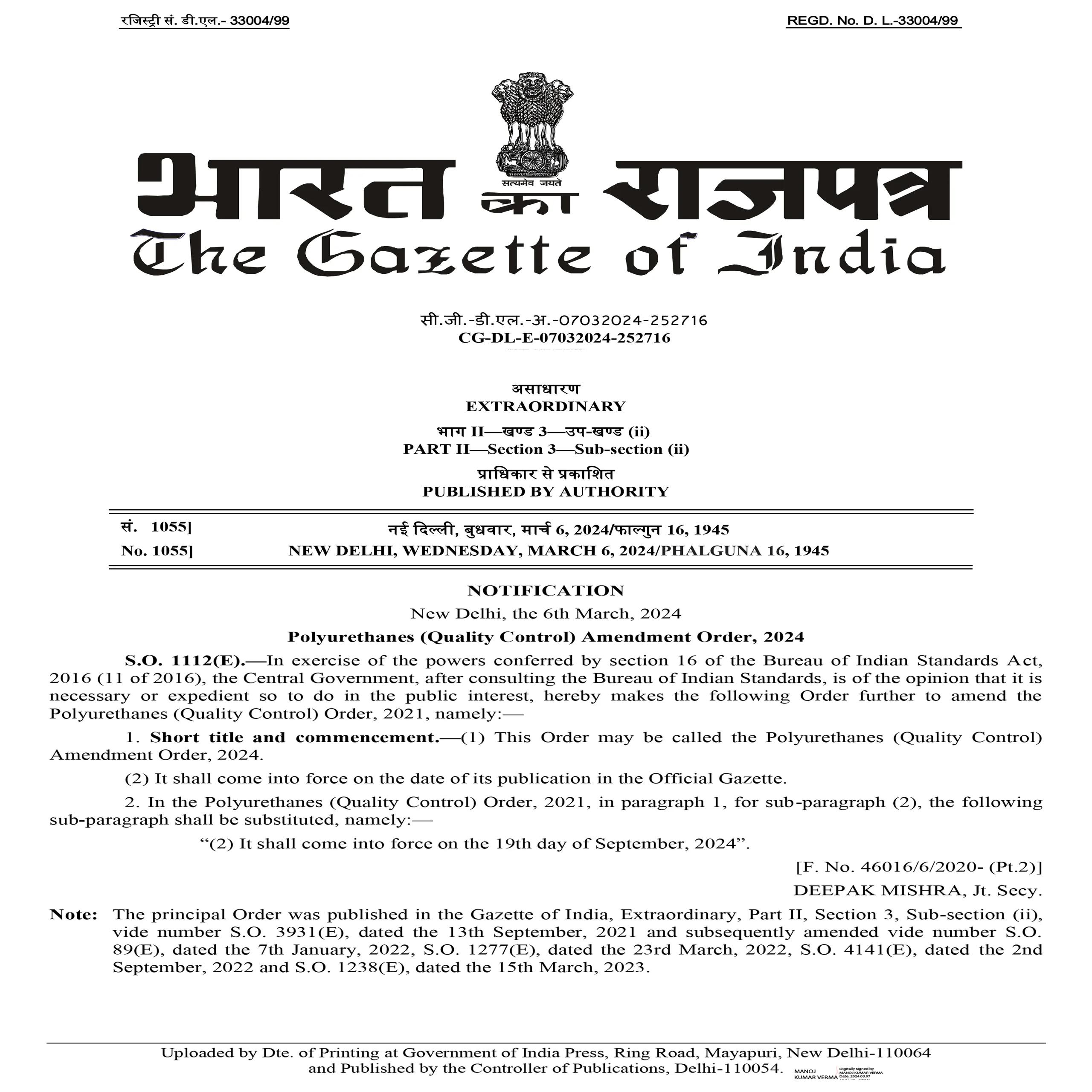 The Department of Chemicals and Petrochemicals, Ministry of Chemicals and Fertilizers, Govt. of India, has issued an order mandating that all TPUs used in India, whether manufactured domestically or imported, must carry the Standard Mark of the Bureau of Indian Standards under a valid BIS licence. This order, effective from 19 September 2024, obliges all TPU manufacturers to apply for and obtain a BIS certification licence.