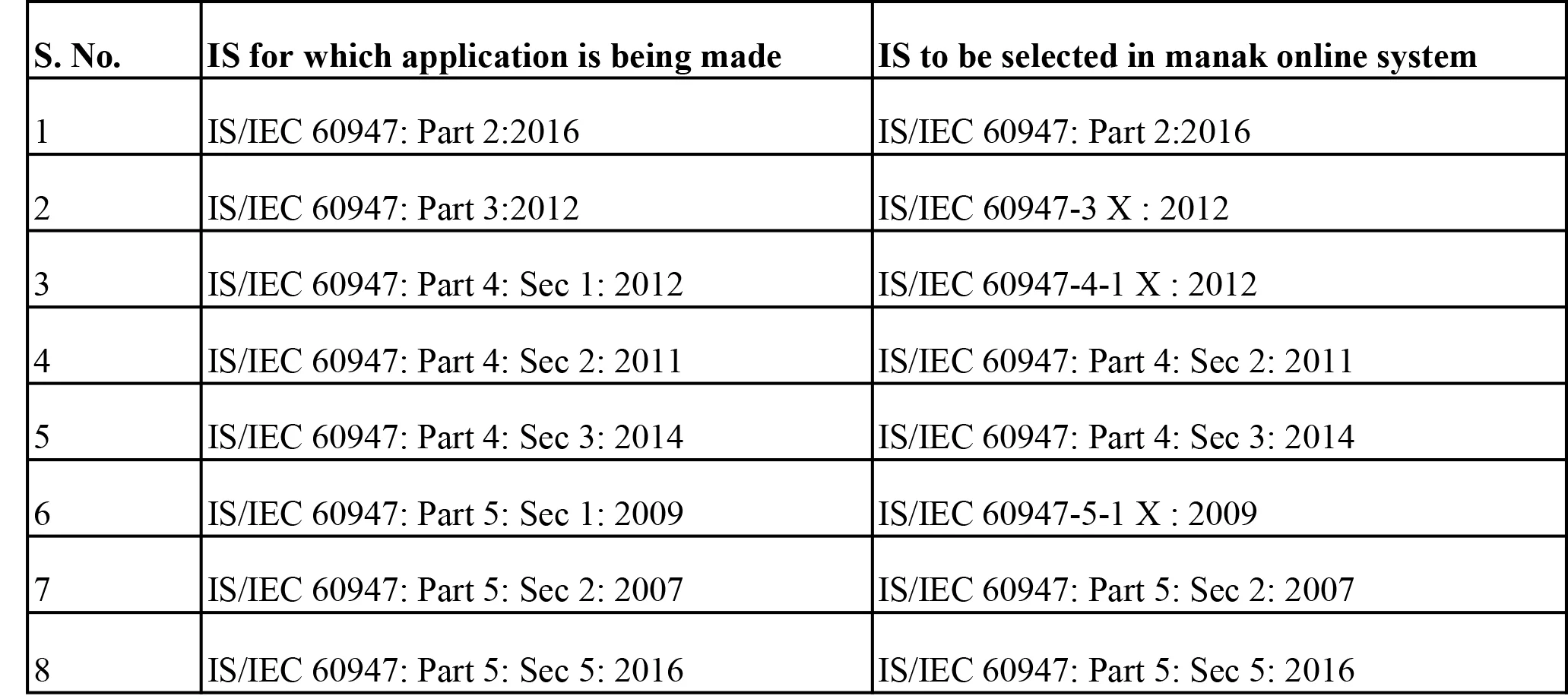 The applicants will be required to choose the Indian Standard (IS) for which the application is being submitted as per column 3 of the following table