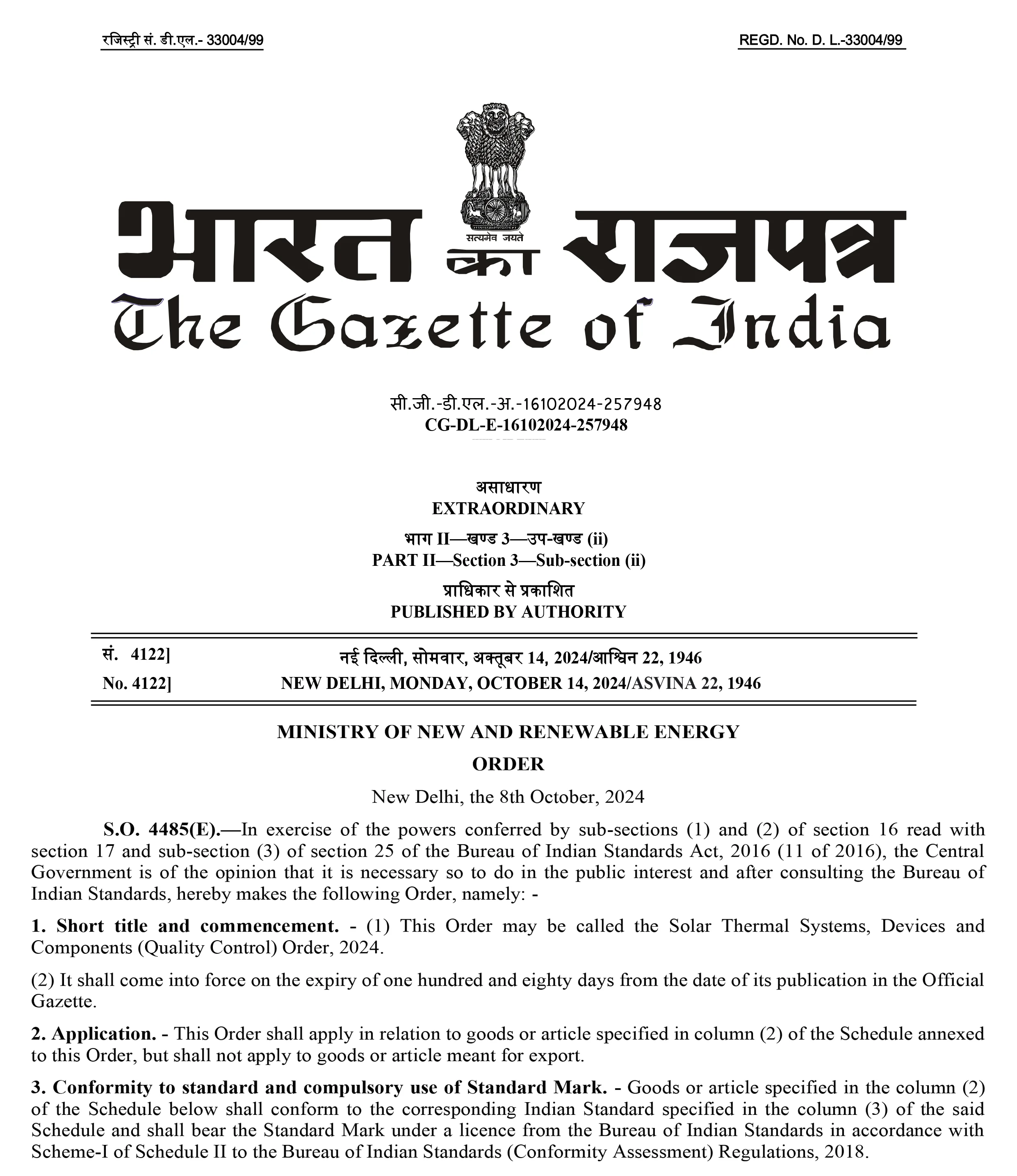 QUALITY CONTROL ORDER (TECHNICAL REGULATION) ISSUED BY THE MINISTRY OF NEW AND RENEWABLE ENERGY, GOVT. OF INDIA FOR MANDATORY BIS CERTIFICATION