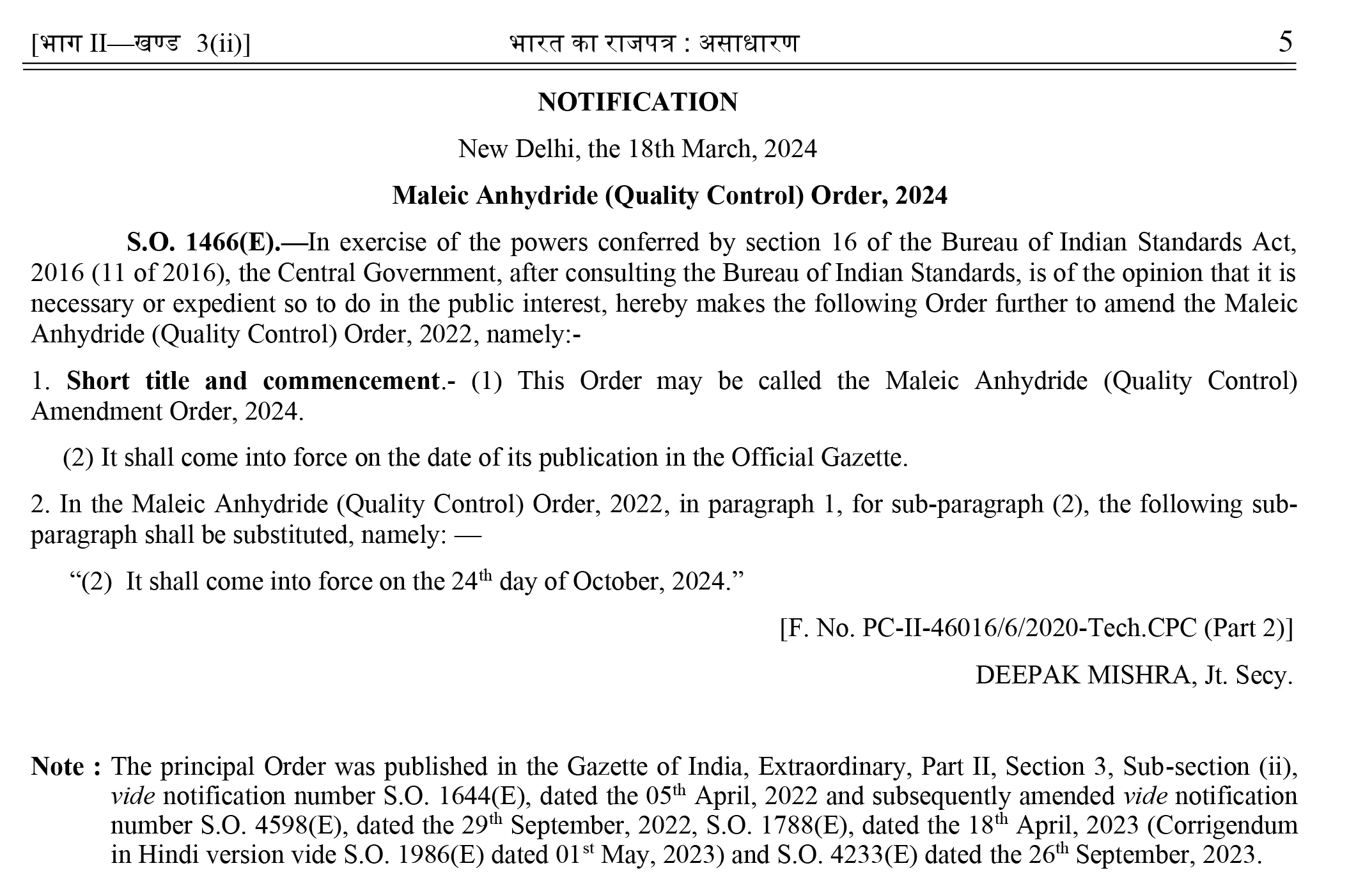 The Department of Chemicals and Petrochemicals, Ministry of Chemicals and Fertilizers, Govt. of India, has issued an order, making it mandatory for maleic anhydride to be used in India, whether manufactured in India or imported from foreign countries, shall mandatorily carry the Standard Mark of the Bureau of Indian Standards under a valid BIS licence. In short, it has become obligatory for all the manufacturers of maleic anhydride, whether in India or overseas, to immediately apply for BIS licence and obtain a valid BIS certification licence before that the last date of implementation of the order, i.e., 03 October 2024.