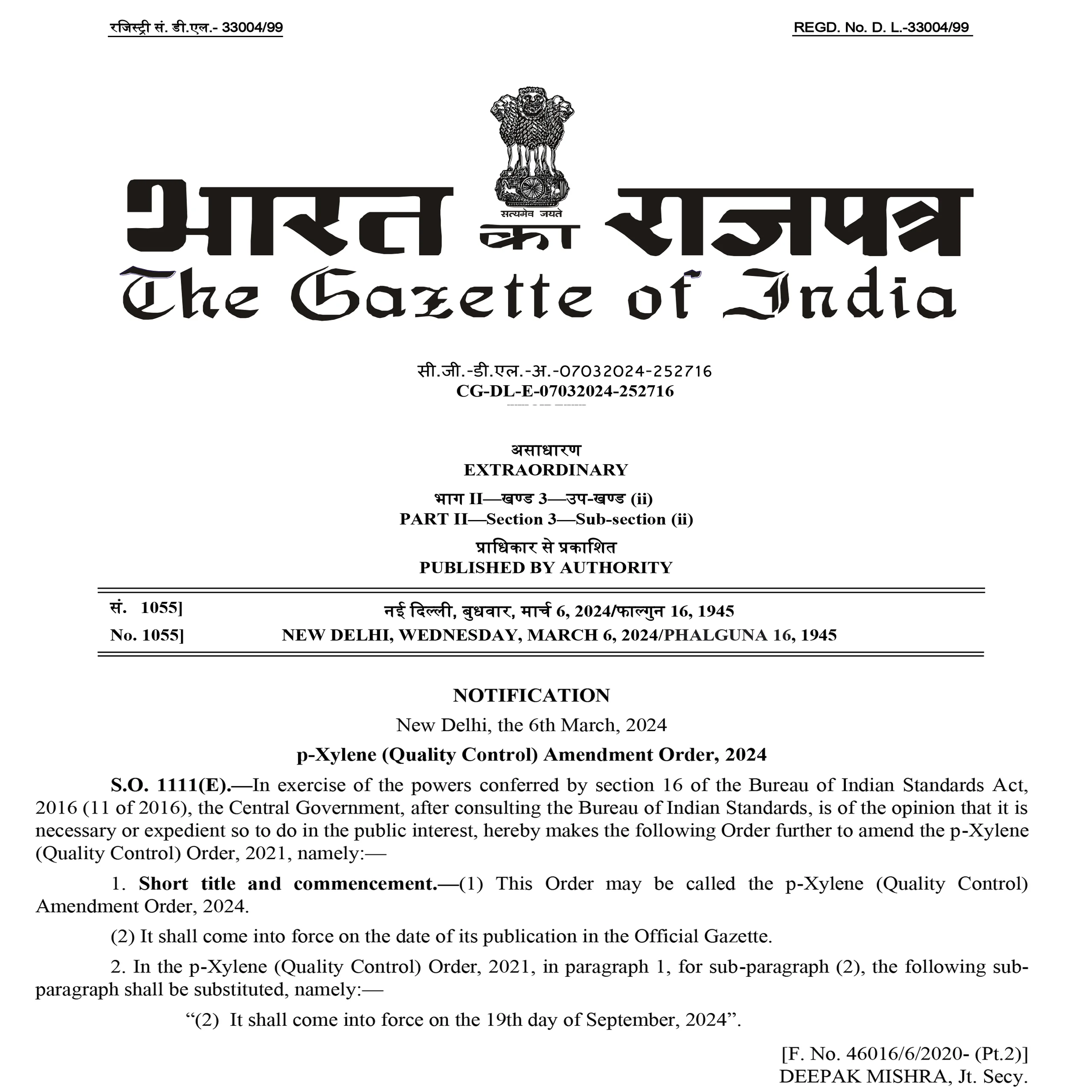 The Department of Chemicals and Petrochemicals, Ministry of Chemicals and Fertilizers, Govt. of India, has issued an order, making it mandatory for p-Xylene to be used in India, whether manufactured in India or imported from foreign countries, shall mandatorily carry the Standard Mark of the Bureau of Indian Standards under a valid BIS licence. In short, it has become obligatory for all the manufacturers of p-Xylene, whether in India or overseas, to immediately apply for BIS licence and obtain a valid BIS certification licence before that the last date of implementation of the order, i.e., 19 September 2024.