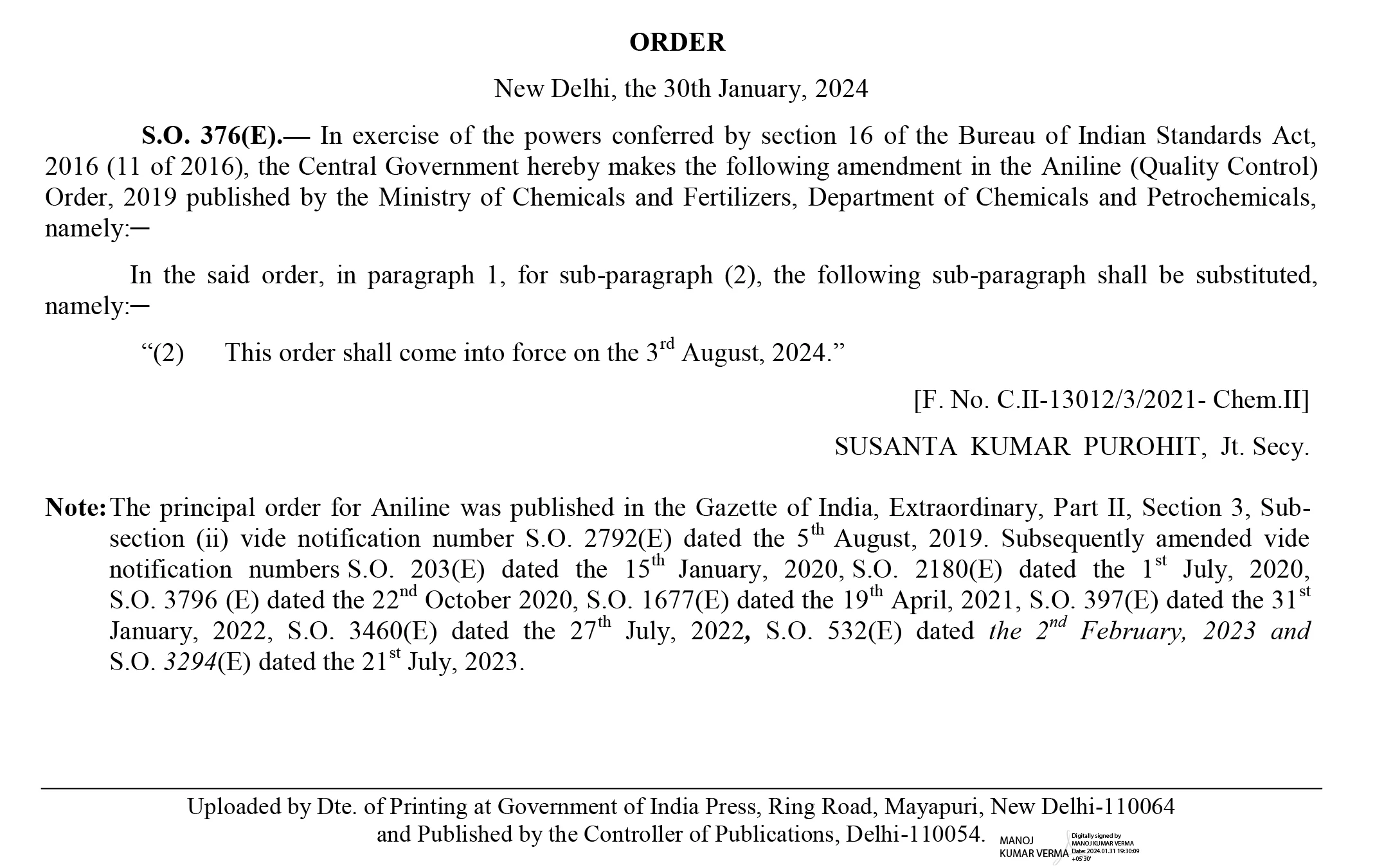 QUALITY CONTROL ORDER (TECHNICAL REGULATION) ISSUED BY THE DEPARTMENT OF CHEMICALS AND PETROCHEMICALS, MINISTRY OF CHEMICALS AND FERTILIZERS, GOVT. OF INDIA ON 30 JAN 2024 FOR MANDATORY BIS CERTIFICATION