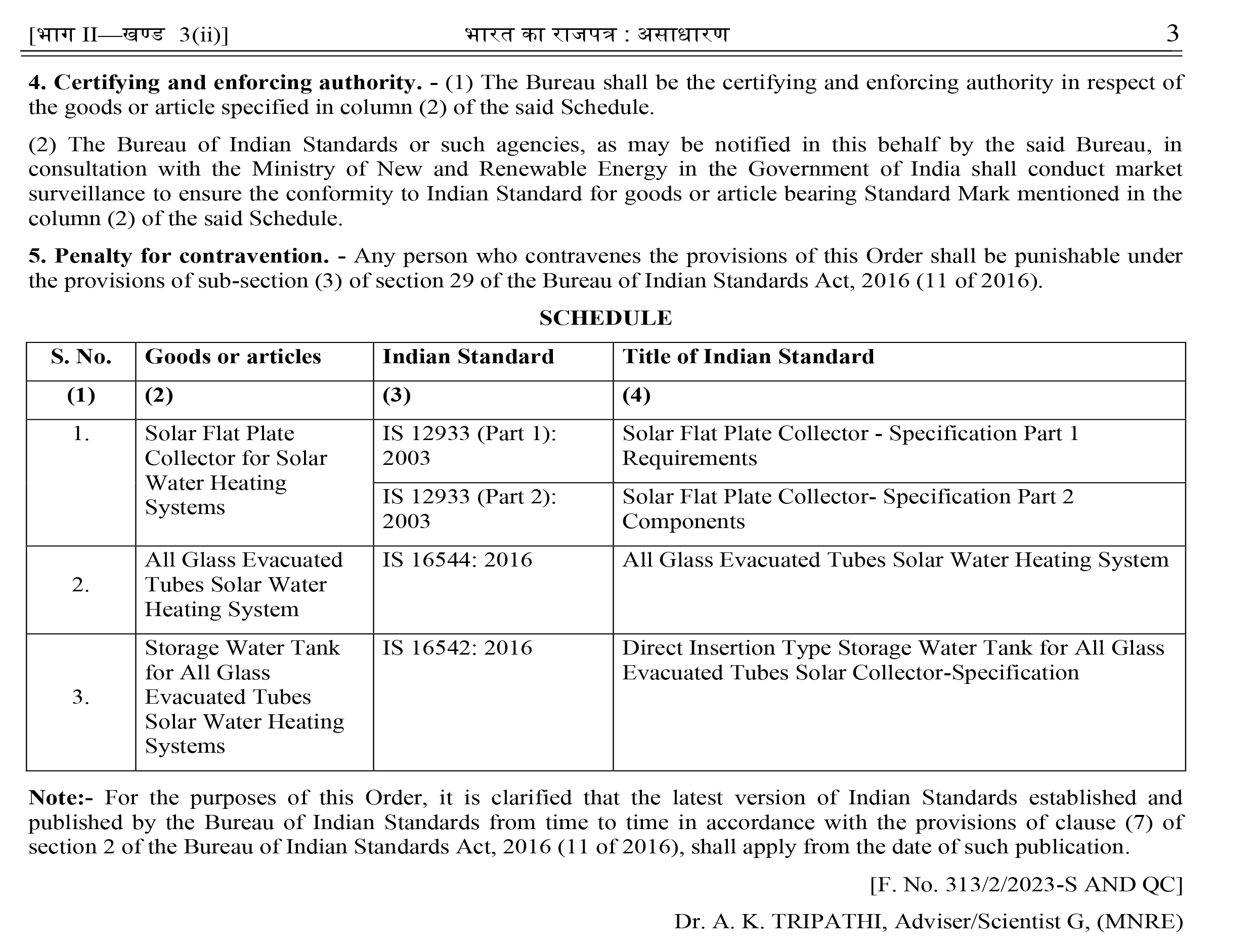 QUALITY CONTROL ORDER (TECHNICAL REGULATION) ISSUED BY THE MINISTRY OF NEW AND RENEWABLE ENERGY, GOVT. OF INDIA FOR MANDATORY BIS CERTIFICATION
