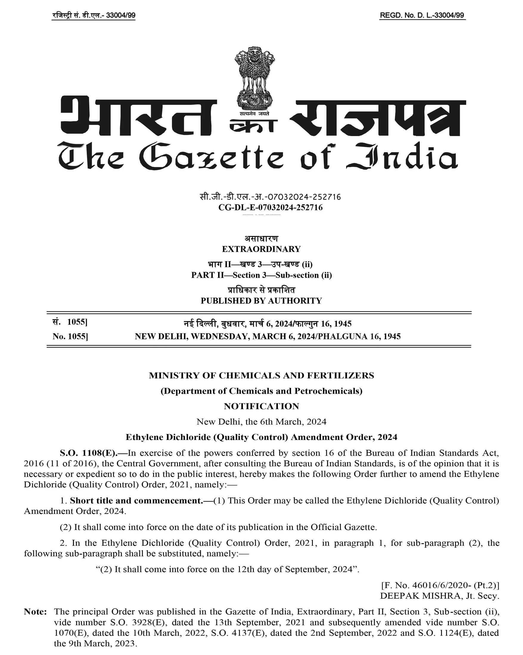 The Department of Chemicals and Petrochemicals, Ministry of Chemicals and Fertilizers, Govt. of India, has issued an order, making it mandatory for ethylene dichloride to be used in India, whether manufactured in India or imported from foreign countries, shall mandatorily carry the Standard Mark of the Bureau of Indian Standards under a valid BIS licence. In short, it has become obligatory for all the manufacturers of ethylene dichloride, whether in India or overseas, to immediately apply for BIS licence and obtain a valid BIS certification licence before that the last date of implementation of the order, i.e., 12 September 2024.