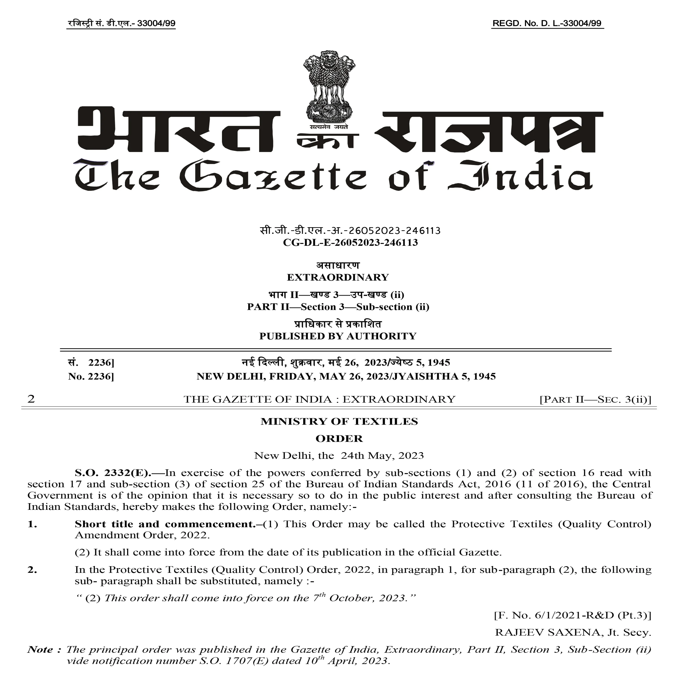 QUALITY CONTROL ORDER (TECHNICAL REGULATION) ISSUED BY THE MINISTRY OF TEXTILES GOVT. OF INDIA ON 24 MAY 2023 FOR MANDATORY BIS CERTIFICATION