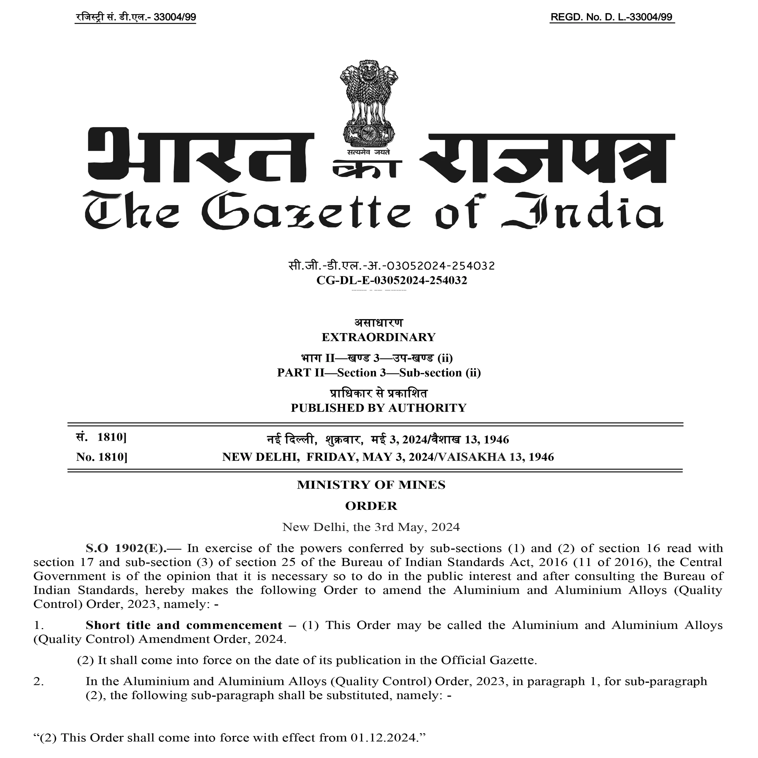 The Ministry of Mines, Govt. of India, has issued an order, making it mandatory for all aluminium ingots for bearings to be used in India, whether manufactured in India or imported from foreign countries, shall mandatorily carry the Standard Mark of the Bureau of Indian Standards under a valid BIS licence. In short, it has become obligatory for all the manufacturers of aluminium ingots for bearings, whether in India or overseas, to immediately apply for BIS licence and obtain a valid BIS certification licence before that the last date of implementation of the order, i.e., 01 December2024.