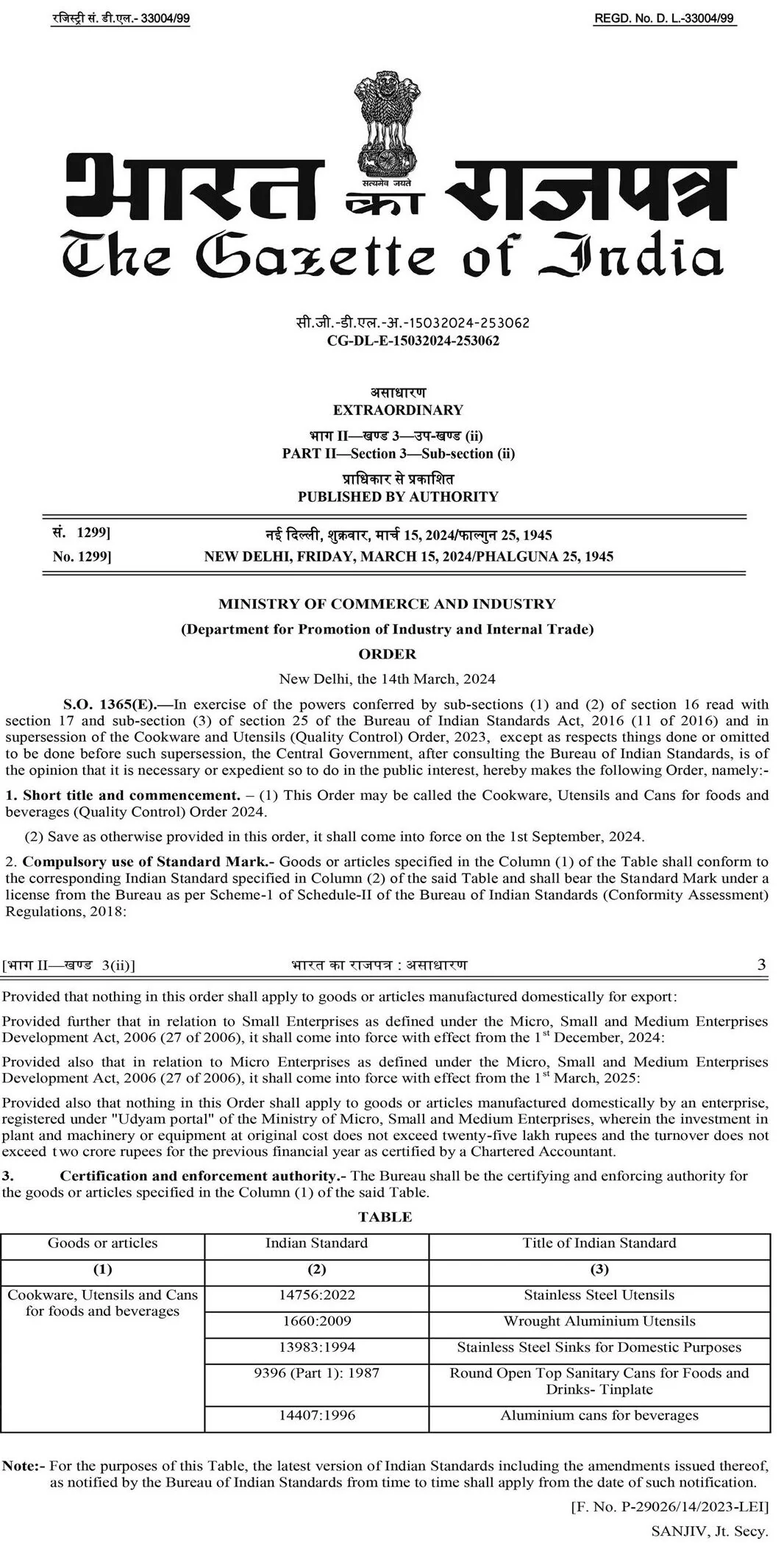 The DPIIT, Ministry of Commerce & Industry, Govt. of India, has issued an order, making it mandatory for all stainless utensils to be used in India, whether manufactured in India or imported from foreign countries, shall mandatorily carry the Standard Mark of the Bureau of Indian Standards under a valid BIS licence. In short, it has become obligatory for all the manufacturers of stainless steel utensils, wherein in India or overseas, to immediately apply forBIS licence and obtain a valid BIS certification licence before that the last date of implementation of the order, i.e., 01 September 2024.