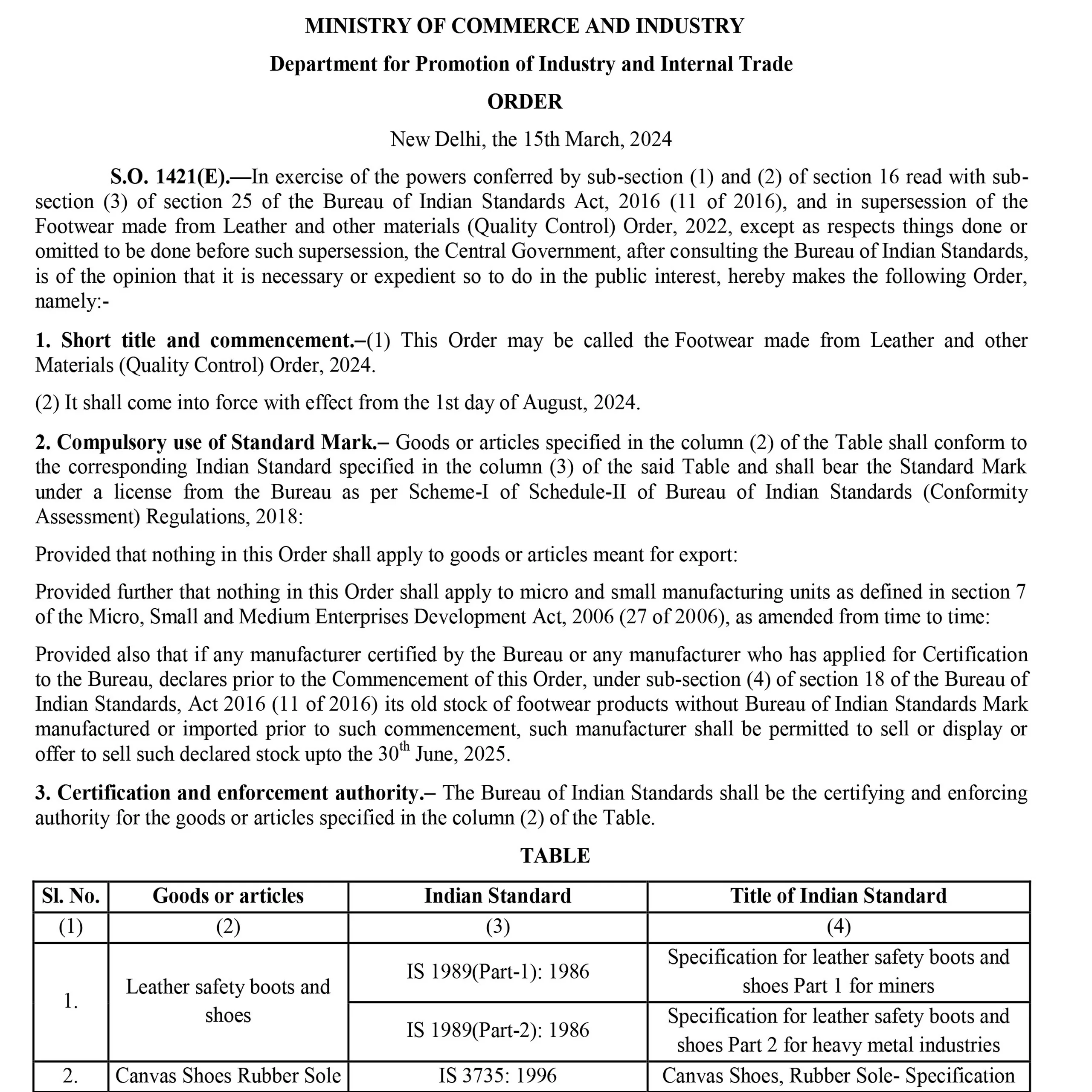 The DPIIT, Ministry of Commerce & Industry, Govt. of India, has issued an order, making it mandatory for all shoes for services to be used in India, whether manufactured in India or imported from foreign countries, shall mandatorily carry the Standard Mark of the Bureau of Indian Standards under a valid BIS licence. In short, it has become obligatory for all the manufacturers of shoes for services, whether in India or overseas, to immediately apply for BIS licence and obtain a valid BIS certification licence before that the last date of implementation of the order, i.e., 01 August 2024
