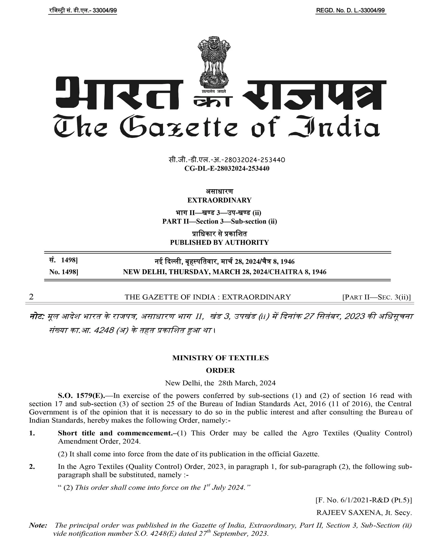 QUALITY CONTROL ORDER (TECHNICAL REGULATION) ISSUED BY THE MINISTRY OF TEXTILES, GOVT. OF INDIA ON 28 MARCH 2024 FOR MANDATORY BIS CERTIFICATION